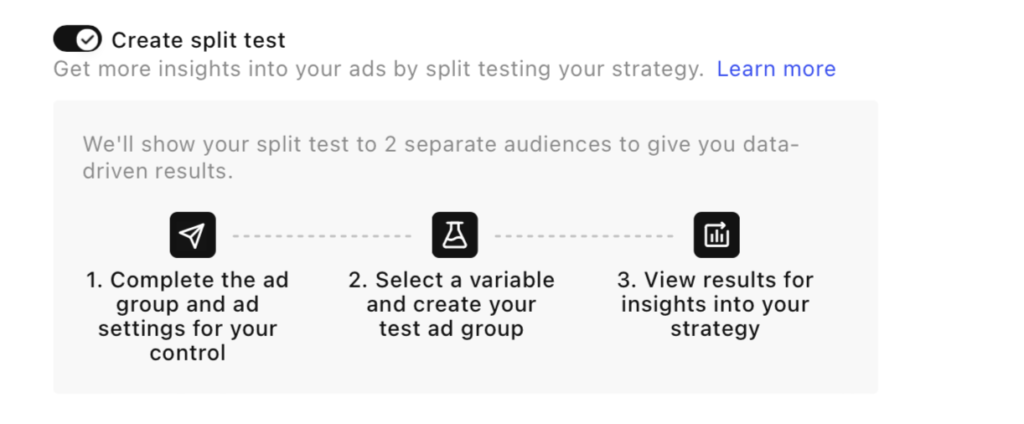 3. Choose a variable to test and a key metric at the Split Test level, which will be used to compare the ad groups and determine a winner. Make sure to set a high daily budget for sufficient testing power.